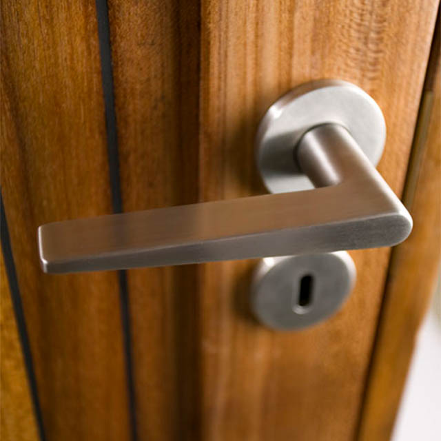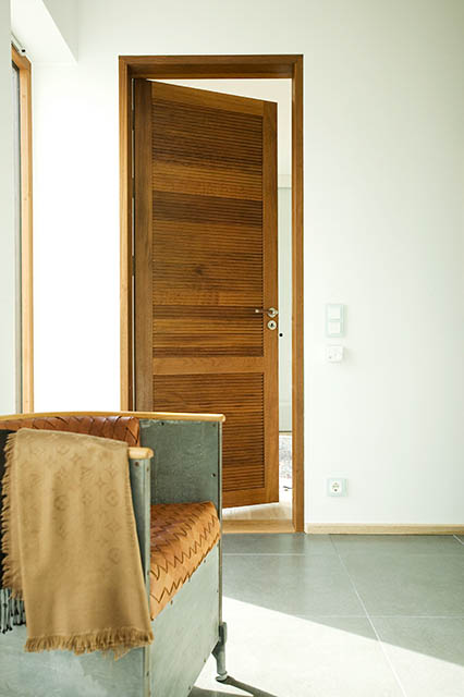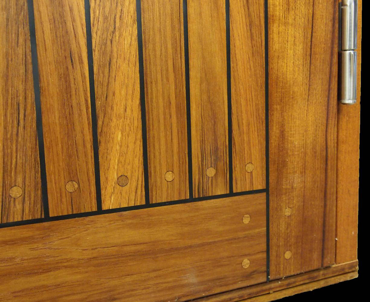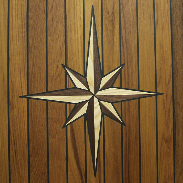 Hamnerö är en innerdörr med massiv teak-ram, dvs. teak rakt igenom hela ramen. Dörrens fyllning består av en nåtad däcksribb på in- och utsida, samt ett intarsia (i massiv ask och valnöt) i form av en vacker kompassros på utsidan.