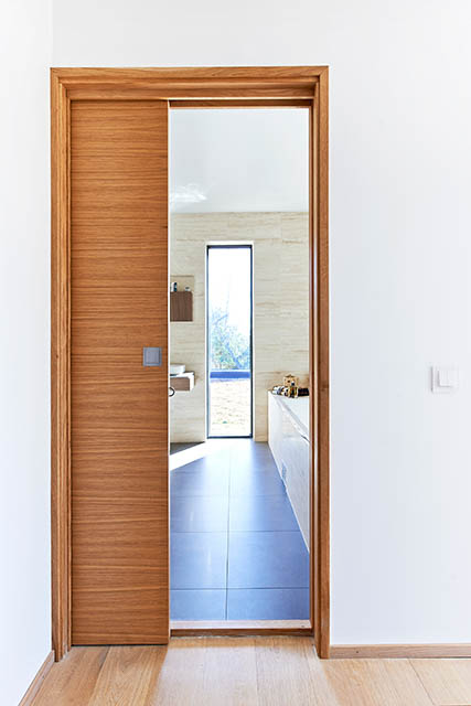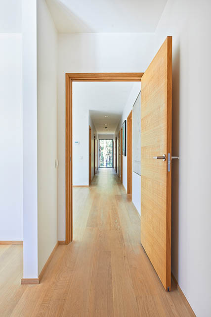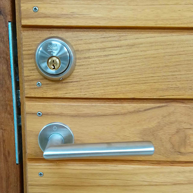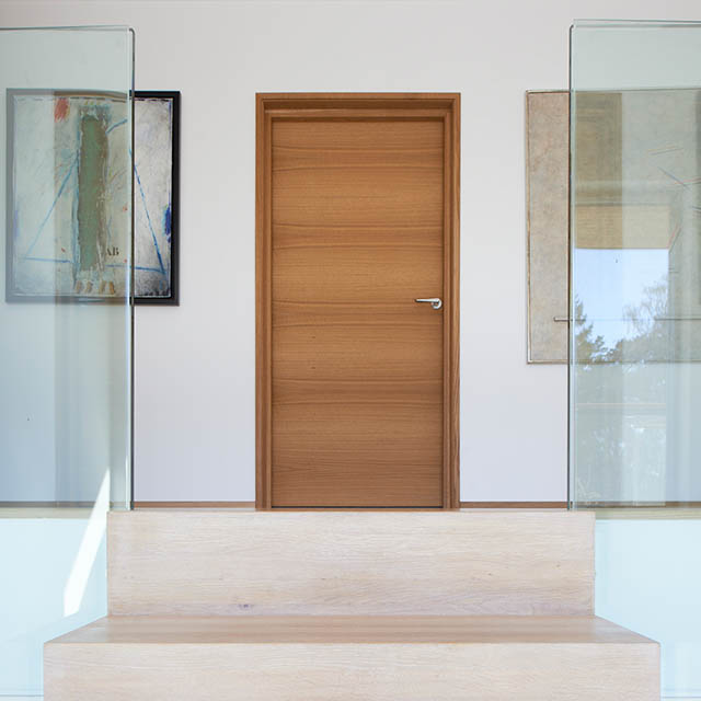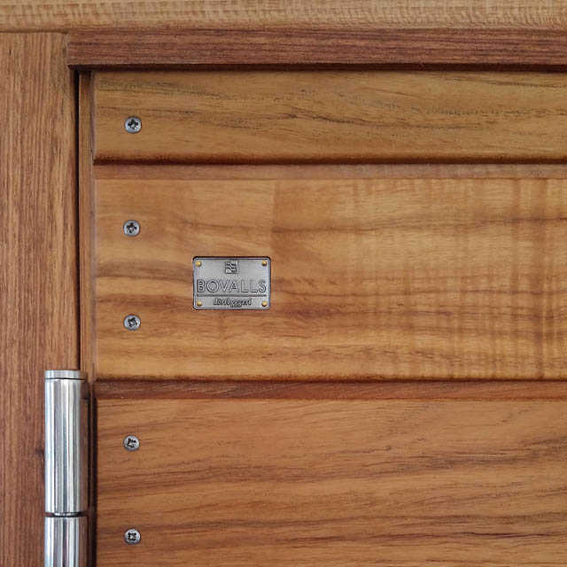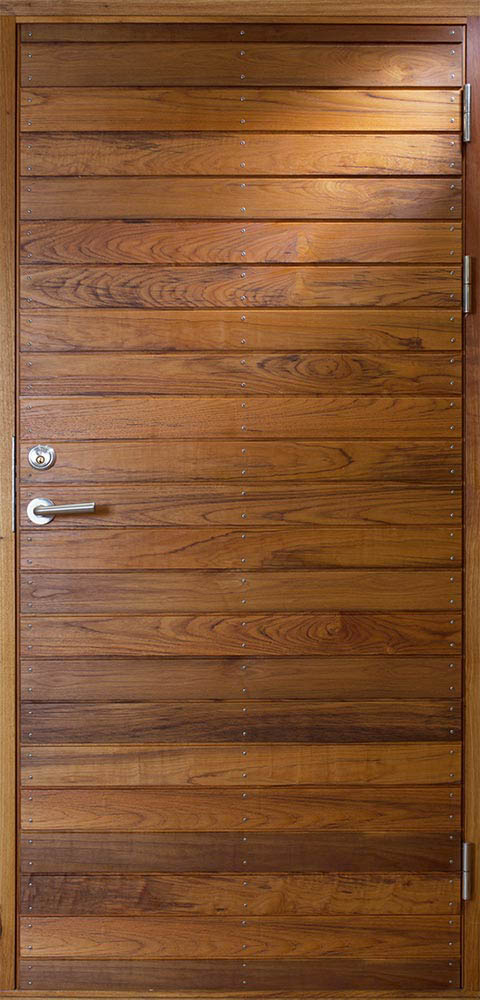 Saltö är en ytterdörr med liggande massiv panel där panelerna är sorterade, matchade och skruvade för hand. Invändigt har dörren en slät yta av faner.