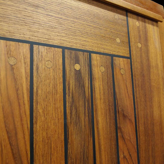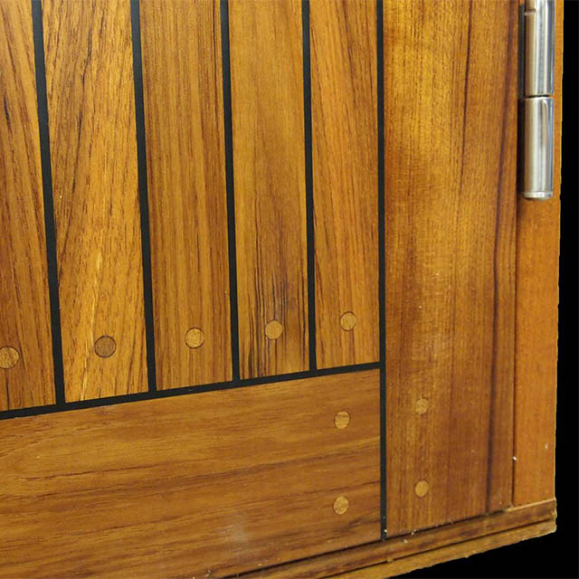 Hamnerö är en ytterdörr där utsidan är klädd med en massiv ram och nåtad däcksribb i teak. Invändigt har dörren en slät yta av teak-infärgat fanér.