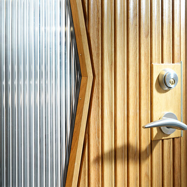Hjärterö är en ytterdörr med stående massiv karosseripanel och med ett stort retro glas. Invändigt har dörren en slät yta av fanér. Behöver du hjälp med att välja eller kundanpassa din ytterdörr? Kontakta oss gärna så hjälper vi dig att ta fram ett förslag som passar dig.