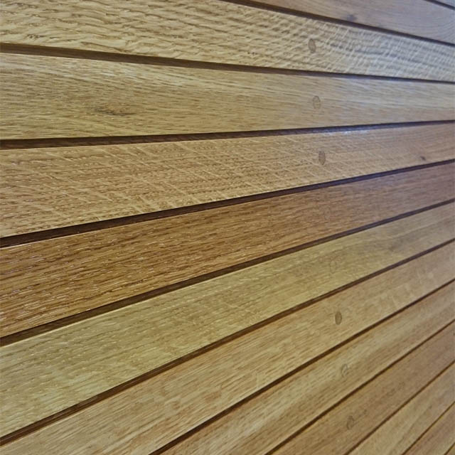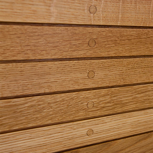 | Paneler | Massivt trä hyvlade i ett stycke skruvade med rostfri A2 skruv, ej spårfrästa skivor. Skruven är försänkta och pluggade med träplugg. |