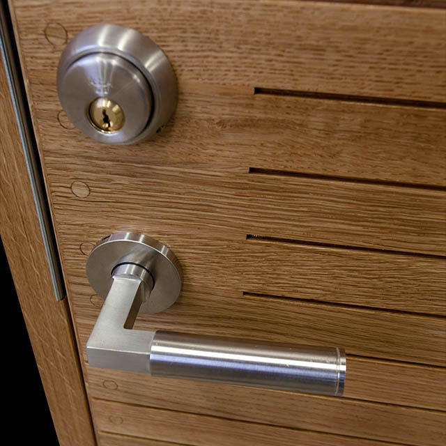 Resö är en ytterdörr med liggande eller stående massiv panel där panelerna är sorterade, matchade och skruvade för hand. Skruvhålen är sedan tätade med en träplugg som huggs av med stämjärn och putsas jämnt med panelen. Invändigt har dörren en slät yta av fanér.