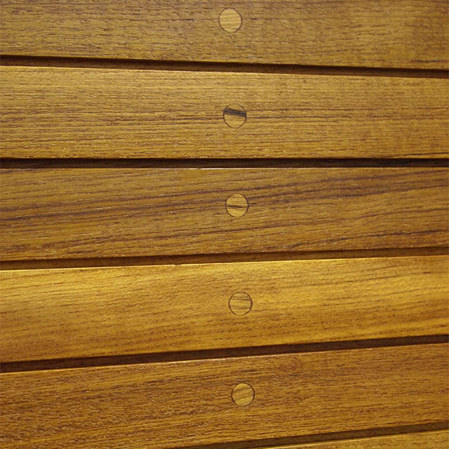 | Paneler | Massivt trä hyvlade i ett stycke skruvade med rostfri A2 skruv, ej spårfrästa skivor. Skruven är försänkta och pluggade med träplugg. |
